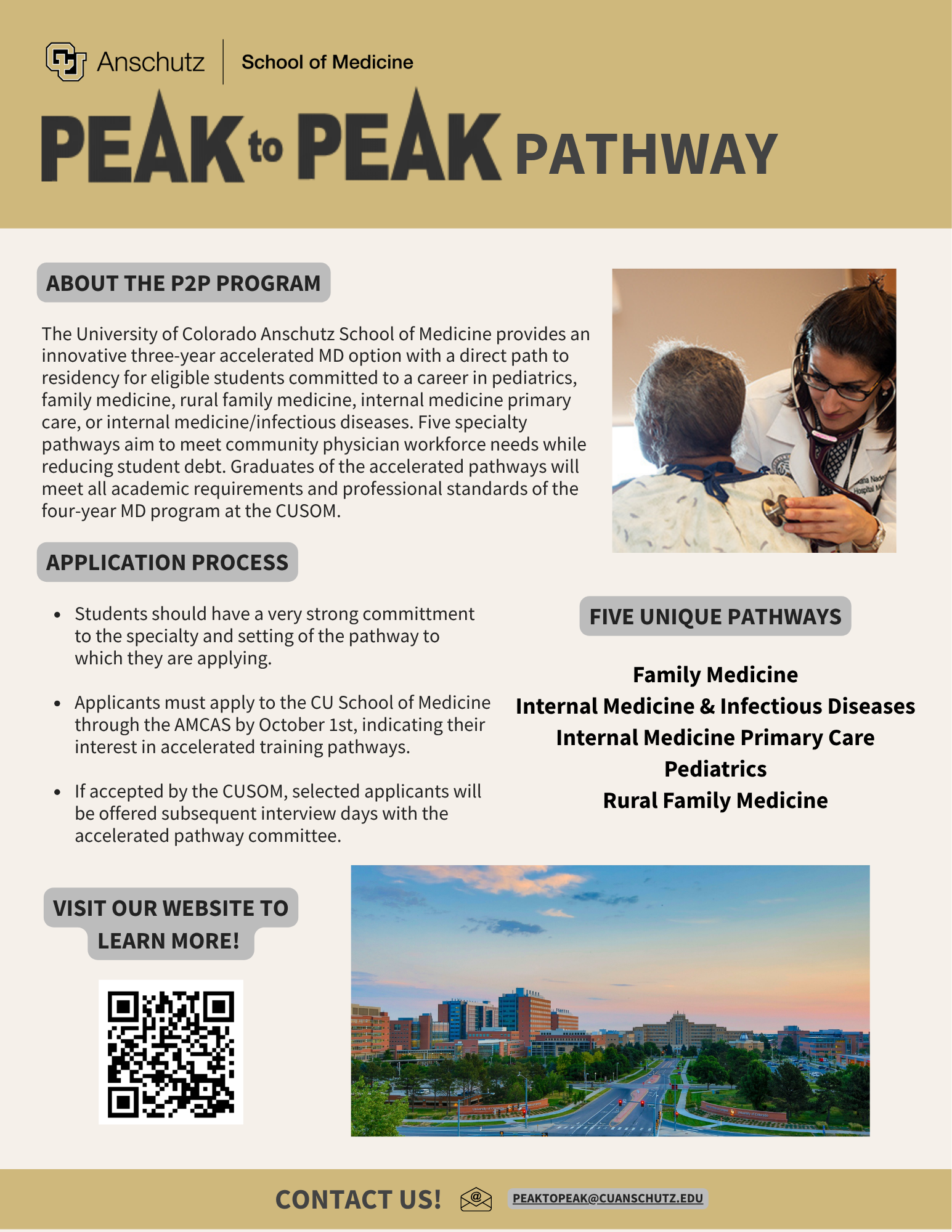 The University of Colorado School of Medicine’s accelerated pathway program delivers accessible, cutting-edge, individualized medical education to strengthen the physician workforce. Through a streamlined curriculum and early, directed transition to residency, the program cultivates mission-aligned physician leaders grounded in community, science, and service, prepared to meet evolving healthcare needs.