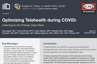 In partnership with ECHO Colorado, the Farley Health Policy Center, designed and implemented virtual sessions to collect primary care stories and experiences with telehealth during the COVID-19 pandemic. This brief presents providers’ experiences with the rapid shift to telehealth and their recommendations to optimize these services in the near future and post-pandemic. Recommendations can provide guidance to payers, policy makers, and administrators in designing policies and strategies to support telehealth services, including clarifying billing and payment, offering guidance on service delivery, promoting equitable access to telehealth, and providing workforce training.
